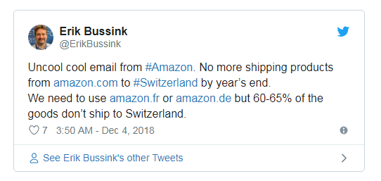 以下是亚马逊发送给消费者的电子邮件节选:“从2018年12月26日起,在亚马逊美国站和其他非欧盟亚马逊站点下单的顾客将无法把包裹发送到瑞士关税联盟的任何收货地址。”