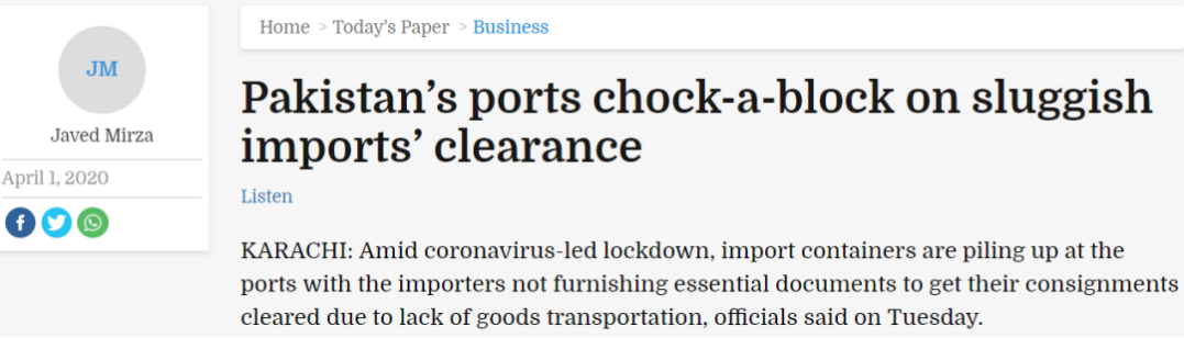 在巴基斯坦主要港口卡拉奇,当地官员周二表示,在冠状病毒导致的封锁中,进口商由于缺乏货物转运条件或没有办法提供必要的清关文件,导致货物集装箱快速在港口堆积。