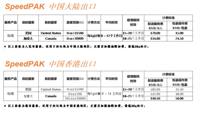 橙联从4月24日起,调整了SpeedPAK跨境物流解决方案从中国大陆及香港地区出口至美国、加拿大路向的运价,具体调整如下: