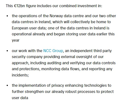 具体的投资如下:首先是挪威数据中心和爱尔兰另外两个数据中心的运营,这两个数据中心将共同成为欧洲用户数据的所在地;爱尔兰的一个数据中心已经投入运营,并于今年早些时候开始存储用户数据。
