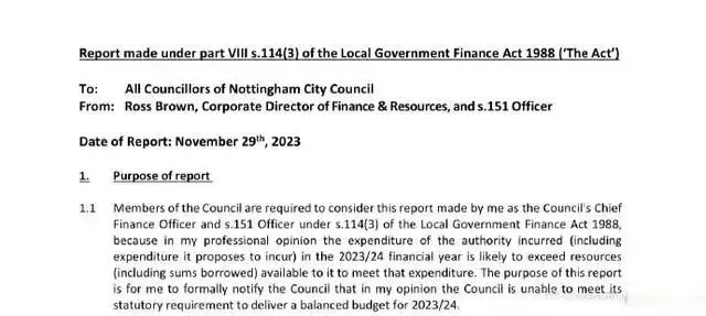 当地时间11月29日,据多家英国媒体报道,英国英格兰中部城市诺丁汉市政委员会宣布该市已事实性破产,并根据《1988年地方政府财政法》第114条发布了报告。