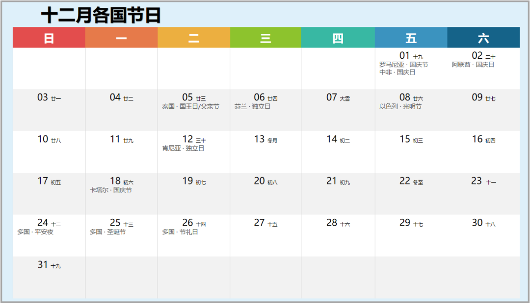 注意:但是,有些国家是不过圣诞节的,包括:沙特、阿联酋、叙利亚、约旦、伊拉克、也门、巴勒斯坦、埃及、利比亚、阿尔及利亚、阿曼、苏丹、索马里、摩洛哥、突尼斯、卡塔尔、吉布提、黎巴嫩、毛里塔尼亚、巴林、以色列等;