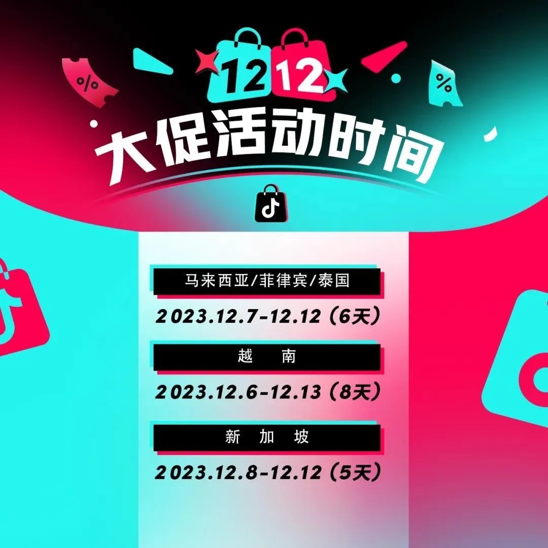 近日,TikTok Shop正式公布了东南亚五国双12大促活动的档期。其中,马来西亚、菲律宾、泰国的活动将在12月7日开启,持续6天;越南的大促活动在6号开启,持续8天;而新加坡站的大促时间则为12月8日—12月12日。
