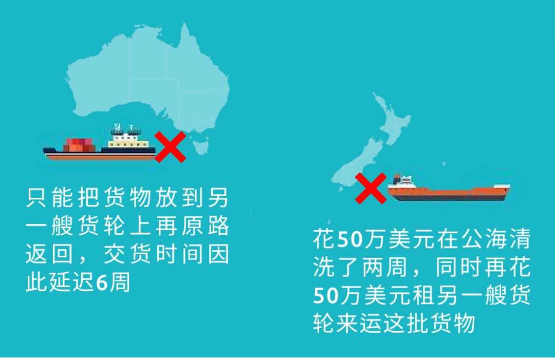 这导致很多船不得不承受巨额亏损。比如英国航运公司PhoenixShipping的两艘商船,就分别在新西兰和澳大利亚港口外吃了“闭门羹”后,一艘花了100万美金解决洗船和交货问题,另一艘船的交货时间则延迟6周。