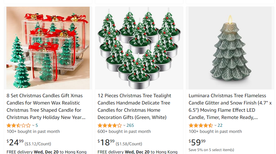 通过观察谷歌趋势也能看到,近 3 个月以来,“圣诞树蜡烛”在互联网的搜索指数也在迅速上扬,出现了一定的强爆发力。而在亚马逊、TEMU上,其相关产品的销量在近期也出现了不同程度的增加。
