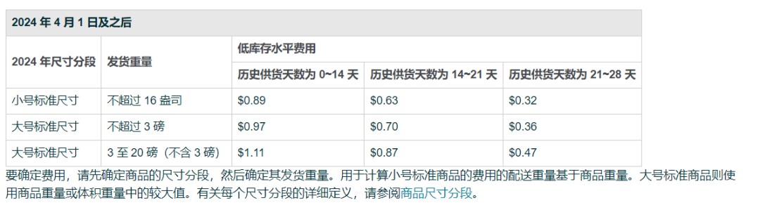 自2024年4月1日起,对于库存水平始终低于买家需求的标准尺寸商品,亚马逊将收取低库存水平费用。