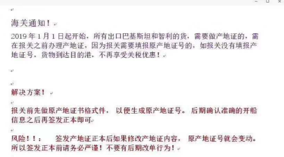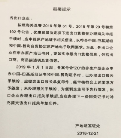 自2019年1月1日起,由于报关需填报原产地证号,所有出口巴基斯坦和智利的货物需在报关之前办理产地证。倘若没有填报原产地证号,货物到达目的港,将不再享受关税优惠。此外,卖家在办理产地证时,还需如实申报出口货物信息,包括出口商、商品描述及货值等。