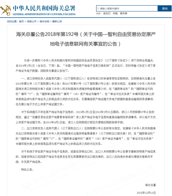 据悉,“中国-巴基斯坦原产地电子信息交换系统”已于2018年4月30日上线,而“中国-智利原产地电子信息交换系统”将于2019年1月1日起上线,未来也可能有更多的国家上线这一原产地电子信息交换系统。