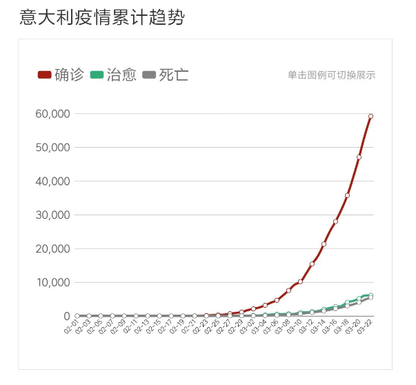 意大利是欧洲的重灾区。截止23日10时09分,意大利累计确诊病例59138例,死亡5476例,治愈6072例。