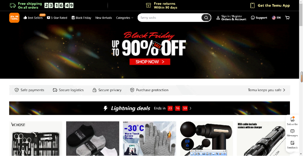 此外TEMU打出了“最高90% OFF”的折扣、每人200美金代金券+免费3件产品任选,以及加码推出购物满0.1美元包邮、用户超过14未收到货将免单、90天不满意全额退款等等,成为了今年黑五战争中的价格王者。