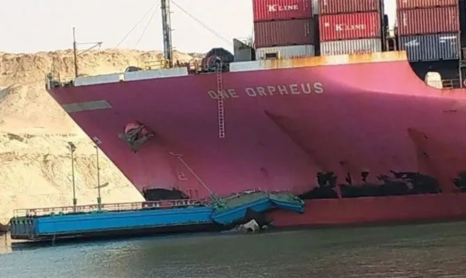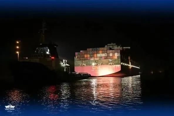 据苏伊士运河管理局(SCA)最新消息称:当地时间12月6日下午,ONE旗下一艘船名为“One Orpheus”、运力高达9040Teu的集装箱船,在经过苏伊士运河时发生严重事故!