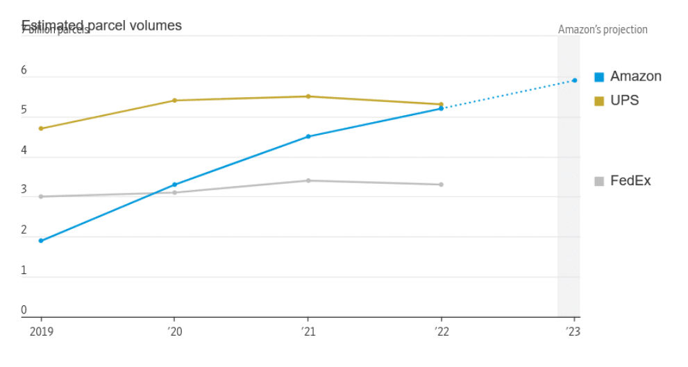 据《华尔街日报》报道,感恩节前亚马逊在美国的包裹递送量已超过48亿件,公司内部预测显示,到2023年底,亚马逊将发出约59亿件包裹,比去年增长13%。2022年,亚马逊递送了52亿个国内包裹。相比之下, 2022年USPS的运输和包裹量为72亿件,UPS处理了53亿件。