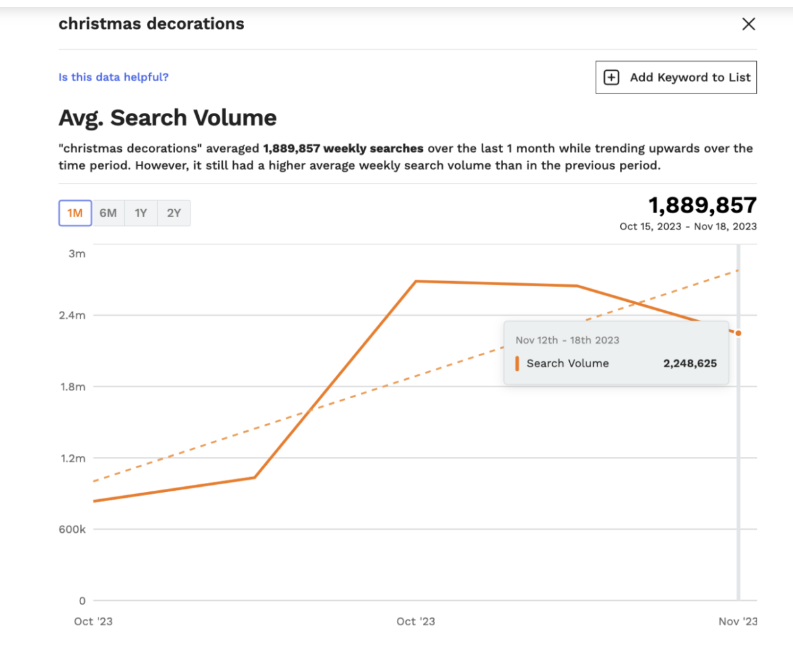 2023年10月15日至2023年11月18日,关于圣诞装饰品的搜索量超过了180万次,对比2022 年 11 月初,圣诞装饰品的搜索量在短短一周内达到了 500 万次的峰值。