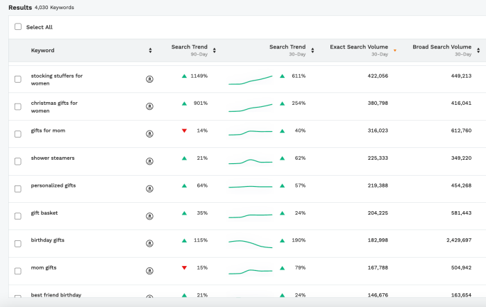 Stocking stuffers for women这一关键词的搜索量在90天内上涨了1100%。