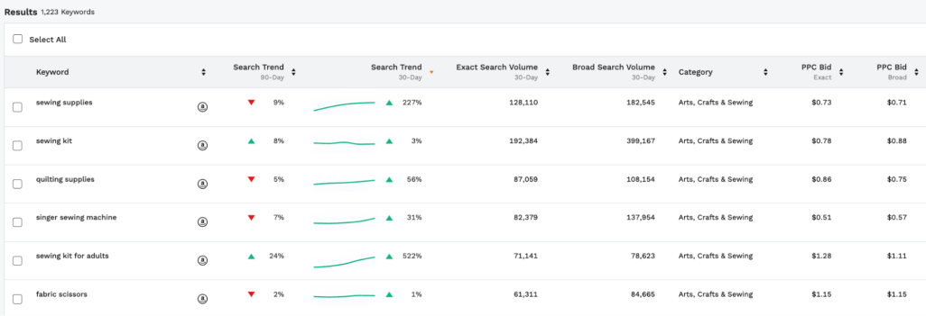 近期搜索趋势不断上升的爱好类产品还有缝纫类相关产品,sweing kit for adults 这一关键词的搜索量在过去30天内增长了522%。