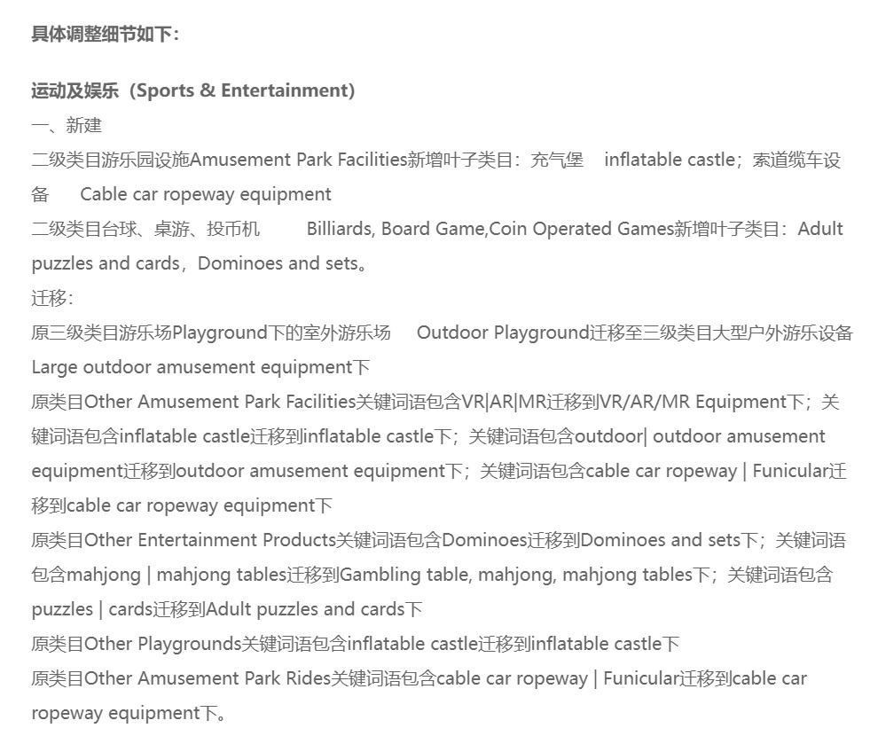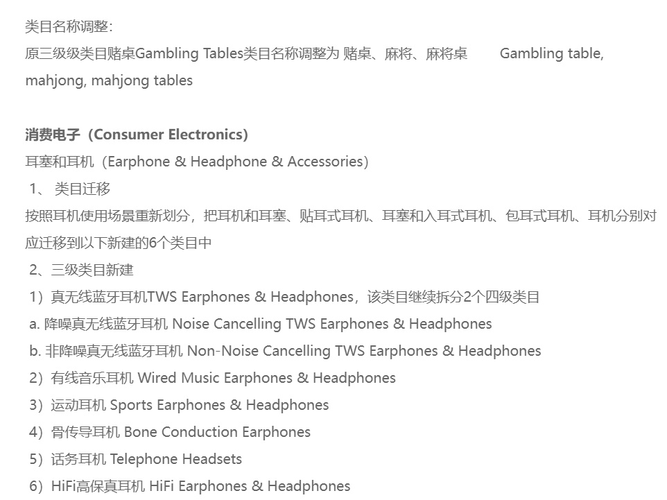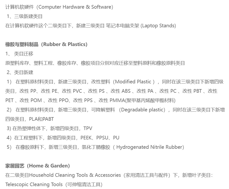 本期国际站发布类目调整覆盖4个行业,分别是运动及娱乐(Sports & Entertainment)、消费电子(Consumer Electronics)、橡胶与塑料制品(Rubber & Plastics)以及家居园艺(Home & Garden)。