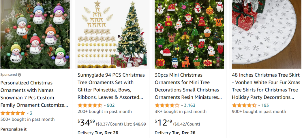 圣诞树装饰品年末的销售量很不错。这些产品在亚马逊上,在售商品listing7万+。然而,这些装饰品很多已经申请专利。比如,每年热销的皇冠树顶、挂饰都已经下证专利。卖家们要特别注意。