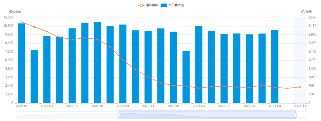 与之形成鲜明对比的是,从2022年至今,全球海运运价综合指数显著下跌。