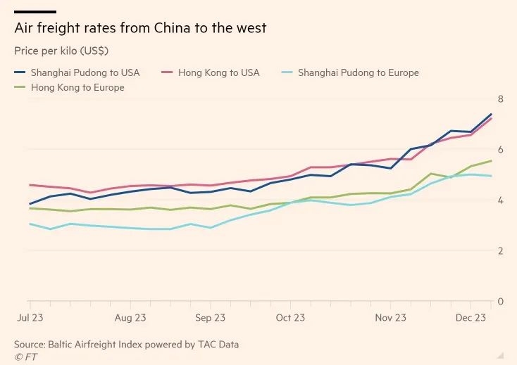 数据显示,自今年下半年起,空运费率显著上升。据了解,从香港和上海出发的跨太平洋航线的空运价格在圣诞节交货高峰期稳步上升,已经高于2022年的水平。